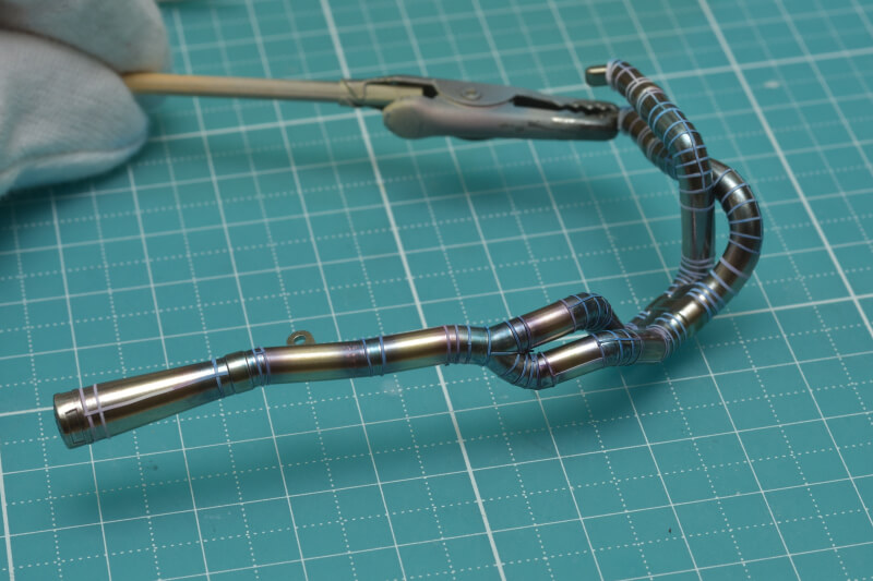 まず「溶接熱による焼け」ですね。手作りのチタンマフラーなんかは軽量化のため、板状のチタンを筒状に巻いてマフラーを作ってたりしてます。