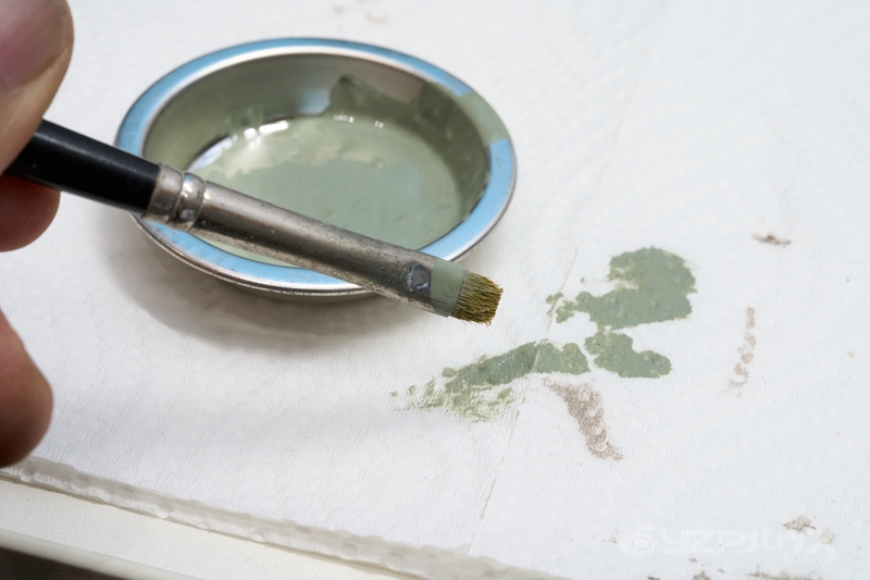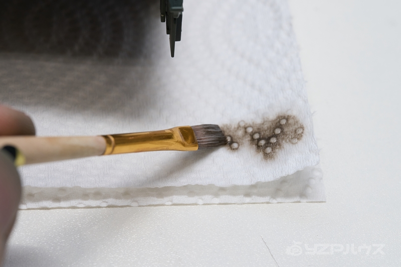 筆に調色した塗料を付け、ペーパータオルで余分な塗料を拭き取ります。