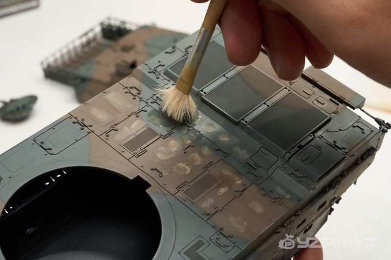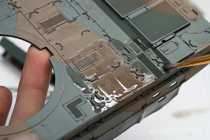 10式戦車のボディは2色の迷彩柄なので、茶色(陸上自衛隊)でも同じようにドライブラシしていきます。