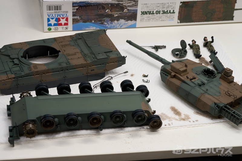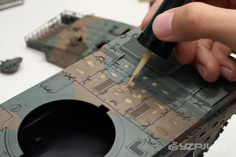 10式戦車は現役で運用されているということもあり、常に綺麗に整備・清掃されている印象があります。というわけで、この記事では「砂埃」をイメージした軽い汚し塗装を中心にし施していきましょう。