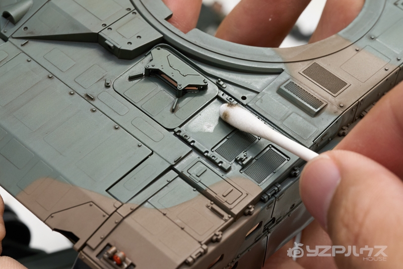 ウォッシングと同じような要領で、【 Mr.ウェザリングカラー塗装→専用の薄め液で拭き取り 】という流れで作業をしていきます。