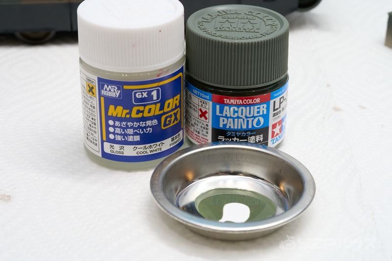 まず、ボディの塗装で使用した濃緑色(陸上自衛隊)に少量のホワイトを混ぜて、ドライブラシ用の塗料を作ります。