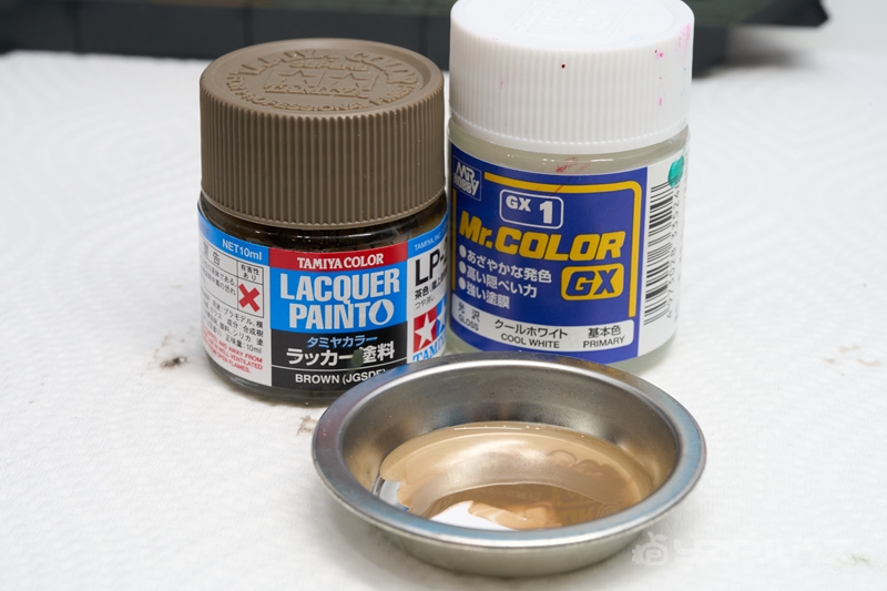 使用するのは、タミヤのスミ入れ塗料「ダークブラウン」をエナメル溶剤で希釈したものです。