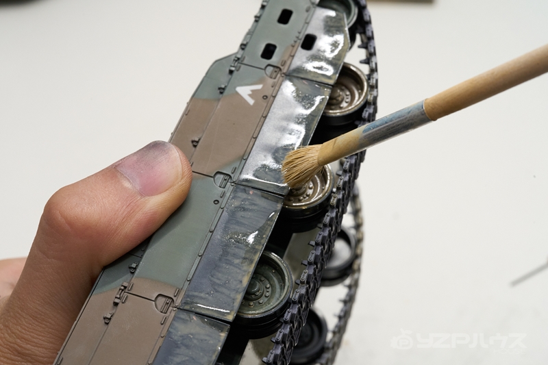 いちばん汚れが付くであろう履帯周りの汚しからやってみましょう。