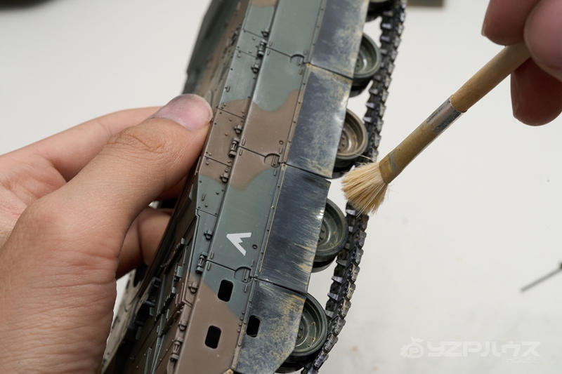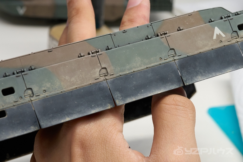 乾いた砂地を走っている10式戦車の写真を観察してみるとサイドスカートはそこまで汚れていなかったので、プラモデルの方もそれに合わせて汚しを控えめにしてみました。