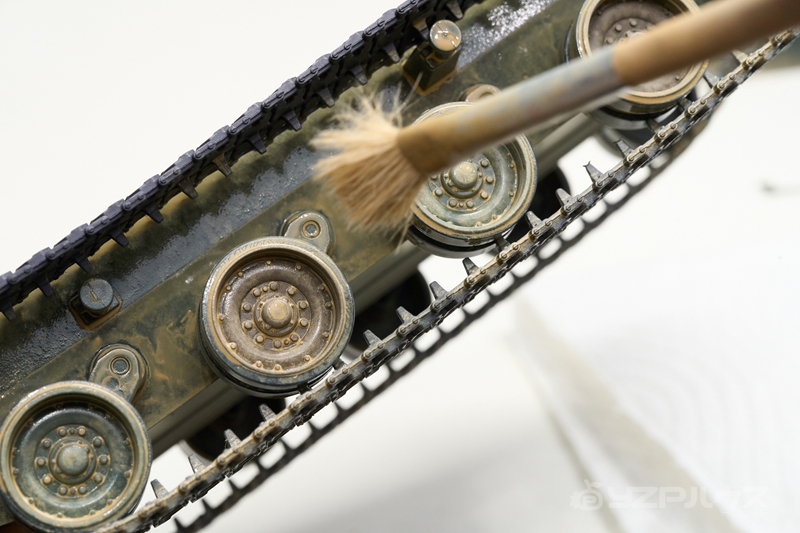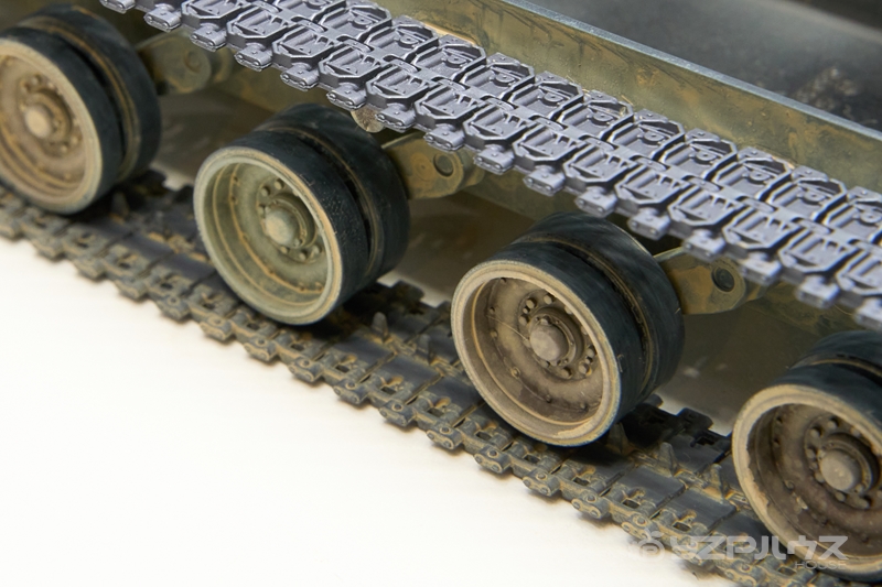 転輪や履帯はいちばん汚れる箇所でもあるので、派手にウェザリングカラーを塗り込みましょう。