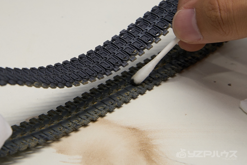 履帯と常に接触している転輪のゴム板も汚れが付きにくいので、専用の薄め液を染み込ませた綿棒で汚れを拭き取っておきます。
