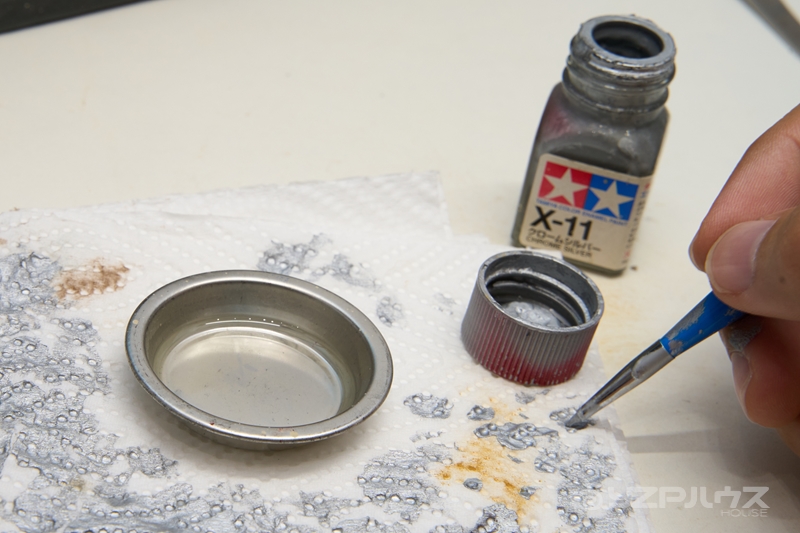 シルバーは金属粒子が含まれており隠蔽力がとても強い塗料なので、ドライブラシと同じ要領で筆で含んだ余分な塗料をキッチンペーパーで拭き取っておくとコントロールがしやすくなりますよ。
