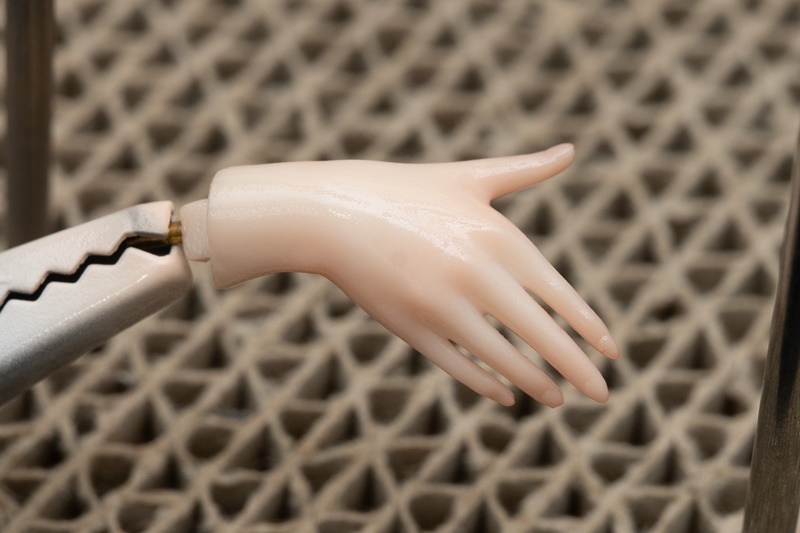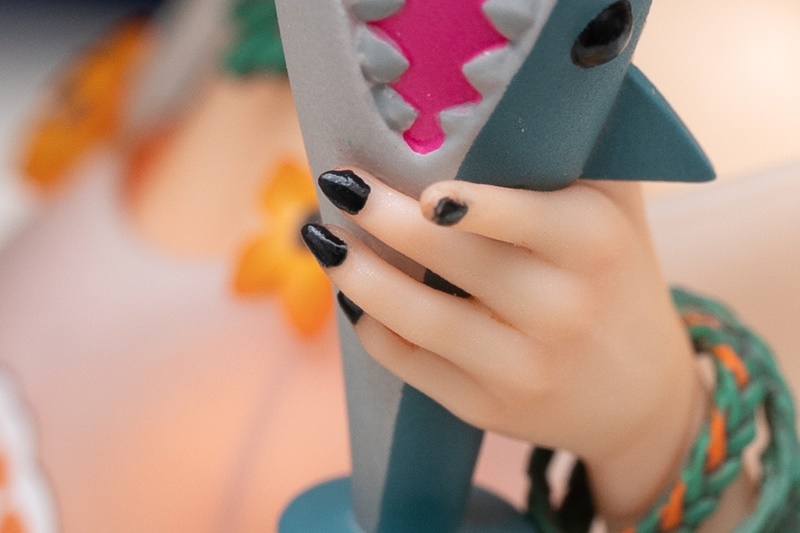 ネイルに関しては、ツヤ感を残したかったので、肌塗装のつや消しトップコートまですべて終わった最後に行っています。エナメルの光沢ブラックをぽってり乗っけて仕上げています。