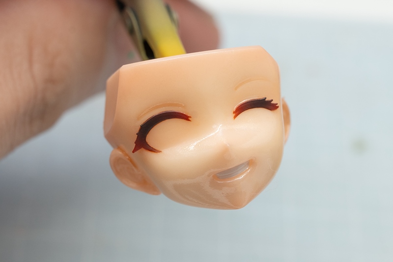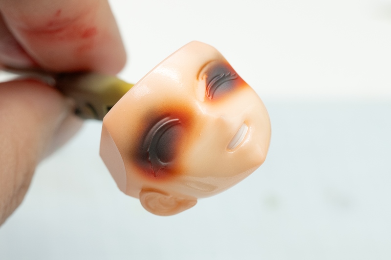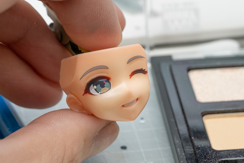 この上から、瞳デカールと眉毛部分を貼り付けたら、モールドありのフェイスパーツの瞳塗装は完了です。