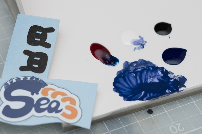 つなぎ目が目立っているので、「S」の色味と同じような青色を調色してみます。必要な量は少ないので、ホワイト、マゼンタ、シアン、ブラック、の4色をペーパーパレット上で適当に調色します。